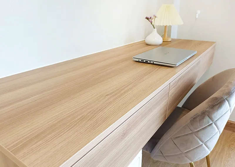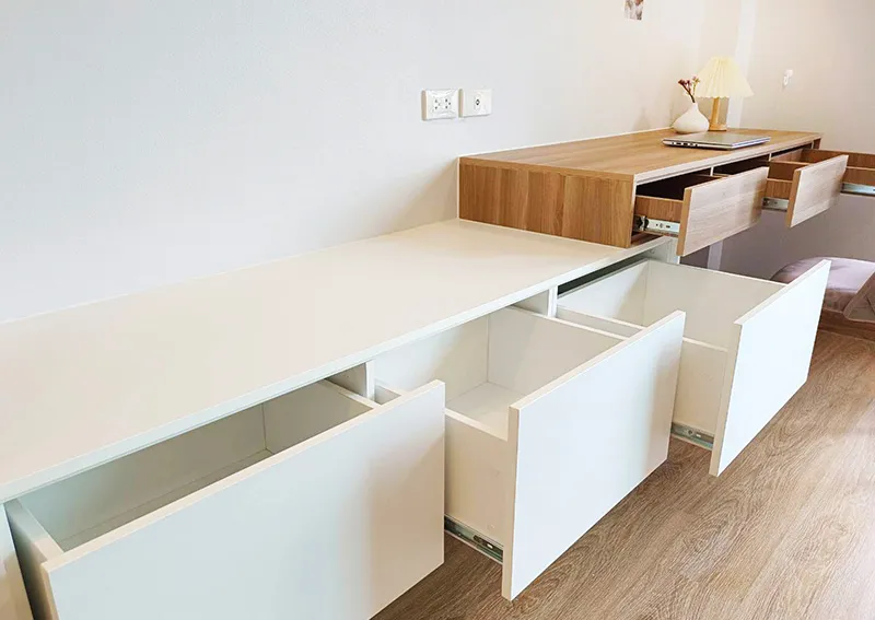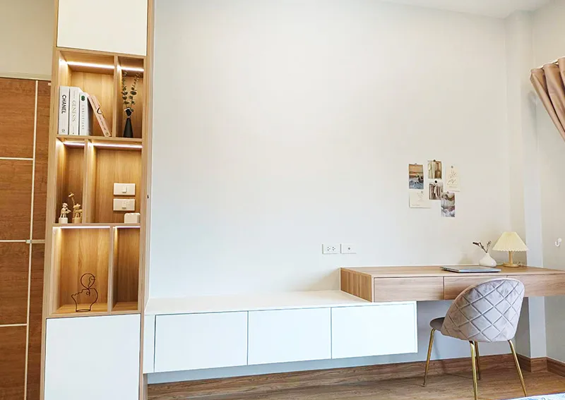 “โต๊ะทำงาน” พร้อม “ตู้โชว์” ที่สามารถเก็บของได้มากมาย โดยจะเราออกแบบให้มีฟังก์ชันที่ตอบโจทย์ได้ทุกการใช้งาน โดยเฉพาะลิ้นชักรางสไลด์แบบกดเด้ง เพราะจะทำให้มีความมินิมอลมากขึ้น เนื่องจากไม่มีปุ่มจับให้กวนใจ ราบเรียบไปกับตัวตู้ได้อย่างลงตัว และเรายังคุม Mood&Tone ของห้องด้วยสีน้ำตาลไม้และสีขาว ทำให้ห้องมีความโปร่ง โล่ง สบายตา มี Feeling ในการทำงานที่ดีตลอดทั้งวัน